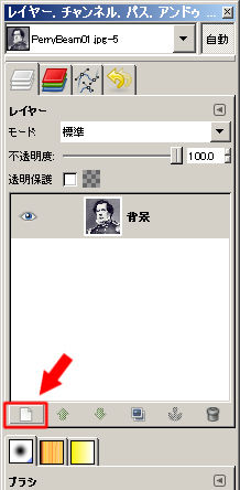 レイヤーウインドウの所に、新規で作るアイコンが左下にありますので、これをクリックします(赤矢印の部分)。