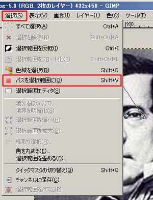 パスで囲われた部分を、選択範囲として指定します。メニューバーから、「選択→パスを選択範囲に」の順で選びます(赤枠の部分)。