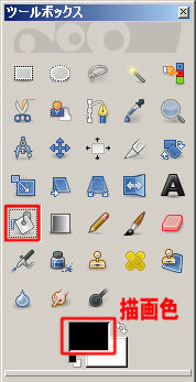 左側のツールボックスから、「塗りつぶし」(上の赤枠、ペンキ缶)を選択します。