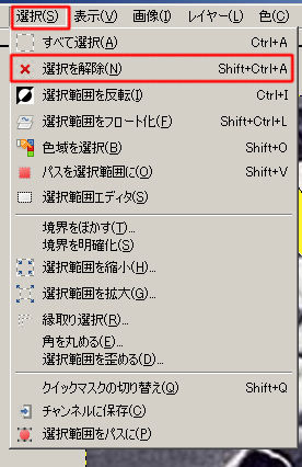 メニューバーから、「選択→選択を解除」の順で選びます(赤枠の部分)。これで選択枠が消えます。