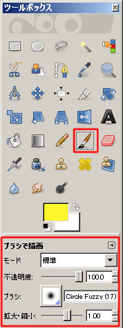 ツールボックスから「ブラシ」を選択(上の赤枠)。ブラシを選択すると、ツールボックスの下の枠の部分に、ブラシの詳細を決定する枠(下の赤枠)が出てくるので、ブラシの形を調整します。