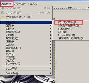 メニューバーから、「フィルタ→ぼかし→ガウシアンぼかし」の順で選びます(赤枠の部分)。