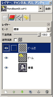 最初にレイヤーを作った要領で、新しい透明レイヤーを上に作っておきます。名前は「ビーム芯」といった具合に。