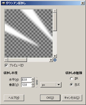 「水平」「垂直」の値を変えつつ、ビームのぼけ具合を調整してみましょう。「プレビュー」にチェックが付いてると、上のウインドウで、ぼかした後はどのような形になるかを確認することができます。