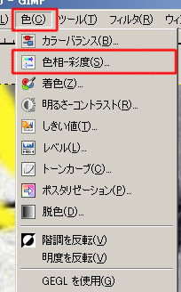 ひとまず、レイヤーウインドウで黄色いビームのレイヤーを選択し、メニューバーから「色→色相・彩度」を選択します。