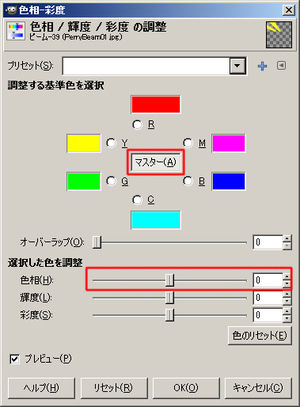 色相・彩度のウインドウが出てきたら、「マスター」を選択し(上の赤枠)、色相のスライダー(下の赤枠)を左右に動かします。