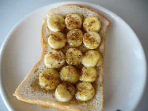 ②そいでバナナを輪切りにしてバターをぬった食パンの上にバナナと砕いたキャラメルをほいパラリ、