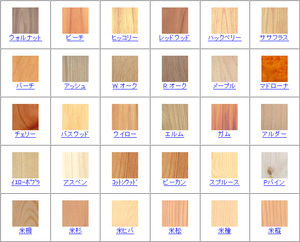 ウォールナット:クルミ。木質はやや重硬で狂いが少なく木肌はやや粗い。木理が美しいため、古くから高級家具材や、工芸用素材として用いられてきた。アメリカでは最も人気の有る材で高級家具に利用されている。
