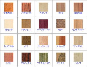 マホガニー:マホガニーは黄金色を意味している。辺材は白から淡い黄色、心材は桃褐色から暗褐色で金色の光沢があり、時間を経ると、濃い色へと変化していく。木目はまっすぐで、肌目はやや粗い。