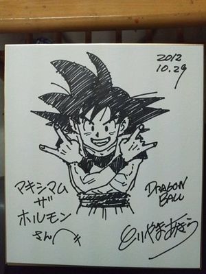 そして最後に余った色紙を見つけてくれた先生が「それも描きましょうか?」と…最後はなんとメタルポーズの悟空っ! 普通の色紙とペンでこんなにも興奮するなんて!泣 夢を感動をありがとうございました!涙 byナヲ http://t.co/a5hcyJ7w