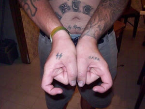 「SS」はナチス親衛隊の頭文字。また親指と人差指の付け根に入れるtatooはコカインを吸う際の目印として使用され、「ドラッグ愛好者」という意味を持つ。
