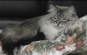 相変わらずたくさん食べて、ただ、体重の方は、獣医さんからあまり食べさせると逆によくないということで、できるだけ、バランスよくと思ってますけれども、なかなかやはり食べ盛りで、我々の目を盗んで、結構、ほかの猫の餌を横からかすめて食べてますけれども、今は元気でやってます。何となく顔つきが、長くいるとそうかな、ロシアから来た時は、いわゆる外国人の顔。