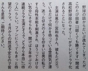 嵐の二宮和也(かずなり)(30)が主演するドラマ『弱くても勝てます』(土曜21時~)。 これは同タイトルのノンフィクションが原作で、超進学校の野球部がその頭脳を武器に勝ち進んでいく青春ストーリー