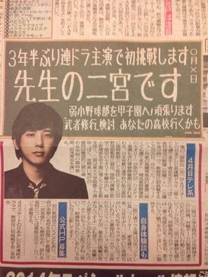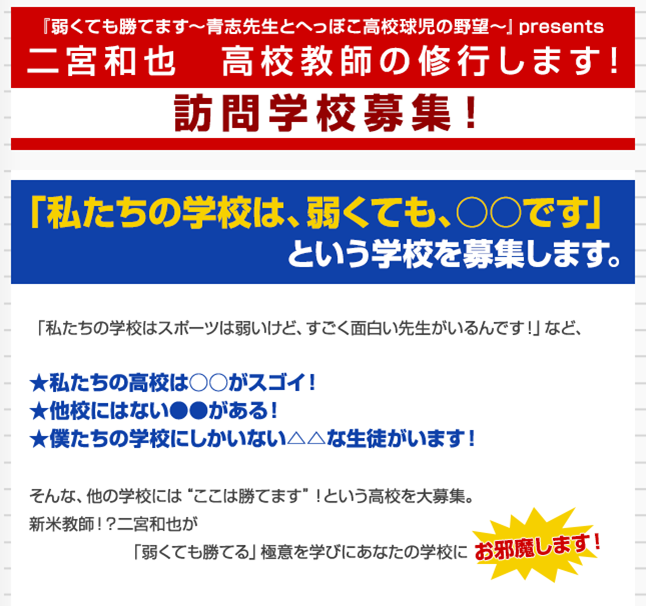 役作りのため高校で教壇に立ち教育実習を行う。二宮和也「先生という存在は誰もが接してきた存在。見ていて気持ちがいいキャラクターになっていければ」と抱負を語る。「甘い球を投げろ」「どうせ20点取られる。ドサクサに30点勝つんだ」といった常識にとらわれない作戦を打ち出す先生役を演じるため、二宮は3月上旬のクランクインを前に高校の教壇に立つことも決定。訪問先の高校はドラマの公式HPで募集し4校ほどをまわる予定。二宮「今回、初の先生役、しかも野球部の監督役ということで、全国の高校に武者修行としてお邪魔していい高校ありましたら、ご連絡下さい」と呼びかけた。