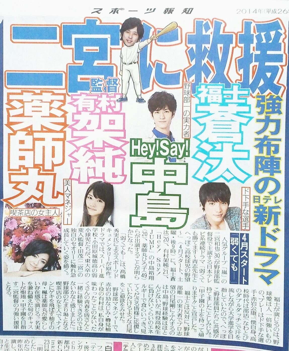 二宮和也主演ドラマ「弱くても勝てます~青志先生とへっぽこ高校球児の野望~」(4月スタート日テレ) 今が旬の人気俳優陣が加わる!! 福士蒼汰、有村架純、薬師丸ひろ子、若手実力派のHey!Say!JUMP 中島裕翔が出演