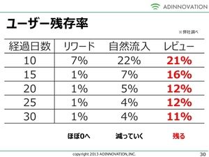 左記の表にもあるとおりDL数を伸ばしてランキングを上げるだけでは”アプリが売れた”とは言い切れません。継続して使うユーザーが多ければ多い程、アプリマネタイズに繋がりやすくなるわけです。