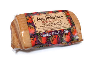 リンゴ果汁を隠し味に使い、さらにリンゴチップで燻製にしたブロックタイプのベーコン。塩分控えめで、爽やかな甘みと旨味がくせになる。豪快に厚切りにして焼くのはもちろん、パスタの具材にしたりベーグルにはさんだりと、いろいろな料理にフル活用できる。