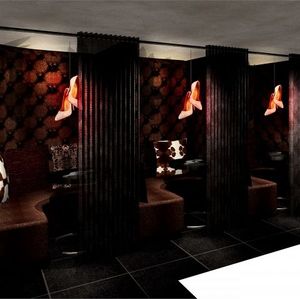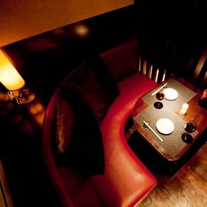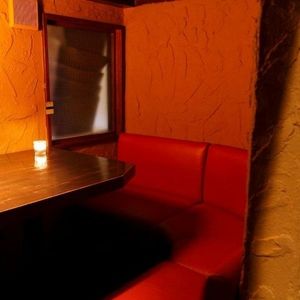 カーテンで仕切られた半個室にL字のソファ。