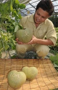 徳島県立農業大学校(石井町石井)で、ハートの形をしたメロンの開発・栽培が進められている。5年目を迎えた今年、ようやく納得のいく出来栄えとなった。恋人や家族へのプレゼント用として高い付加価値があり、農大は「将来は県内の農家での普及を目指したい」と力を込める。