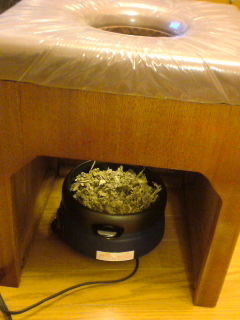 小さなイスのようなものに丸い穴が空いていて、よもぎと漢方のブレンドしたものの蒸気を体から吸収します