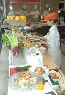 北海道フェア、スペインフェアなどテーマに応じた料理に加え、大人気の牛ロースの鉄板焼き、豚肩ロース肉のオレンジ風味焼、白身魚のムニエル、蟹クリームコロッケ、チキンのグリル系からフルーツ系、ケーキ(ムース系、タルト系、洋梨、ベリー、チョコ、ロールケーキ等)、ゼリー、ぜんざい、アイスクリーム(レーズン、イチゴ、チョコチップ)などデザートまで充実の料理