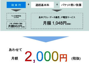 同社は全く新しいモバイルの仕組みである「freebit mobile」により、端末代金(24回分割の場合、月額952円から)と基本プラン(通話基本料とパケット使い放題)の合計で月額2,000円という料金を可能にした。