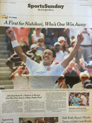 テニスの全米オープンで錦織圭選手(日清食品)が世界ランキング1位のノバク・ジョコビッチ選手(セルビア)を破り、四大大会シングルスで日本勢初の決勝に進出した