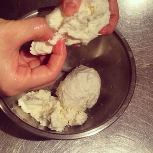 まずは、モッツァレラを「ちぎる」。包丁で切ると、ソースがからみません〜。