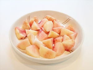 1)まずは桃を適当な大きさに切り、皿に盛る。