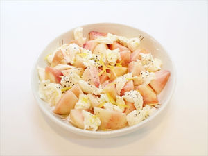 3)オリーブオイル、白ワインビネガーを回しかけ、塩とコショウを振り、レモンの皮(千切りまたは粗く削ったもの)を散らして完成!
