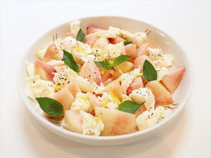 桃モッツァレラ。とてもマッチしていて美味しいレシピだが、レシピ通りにつくらないと味がかなり変わってしまうという