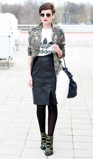 ボーイッシュなイメージのスタジャンもタイトスカートと合せればトレンド感のあるスタイリングに。