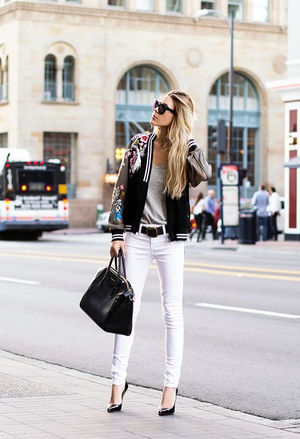 スタジャンにコーディネートして女らしさをキープできる、パンツのおすすめは白パンツ。