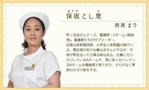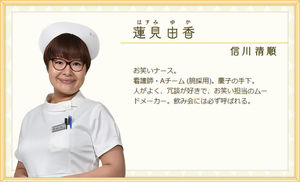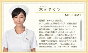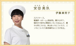 大学病院出身で技術と経験の持ち主。難しい事態ではかなり頼りになる人材。バツイチで2歳になる息子を育てているため、夜勤やシフトをたくさん入れ給料を稼いでいる。そのため、いつもお腹が空いている。食べ物をくれた人はいい人に見えるため、とし恵についている。