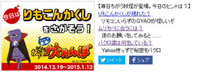 映画公開の前日となる12月19日(金)から「妖怪かくれんぼ」 というWEB上で妖怪ウォッチグッズをプレゼントする企画をスタートします!早速ヤフー検索でニャフーと入力し、妖怪のヒントをもらい妖怪をみつけました!今回はりもこんかくしをさがそう!