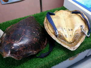 実物の亀の甲羅を背負ったり…