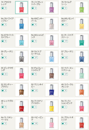 クリアな感じと、ラメに惹かれて、赤、紫、黄色、オレンジ、緑、青、白を買いました。購入後、試し塗りでこの7色全部を爪にぬってみたら、ボトルどおりの発色!!!すっごいカワイイです!