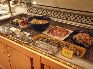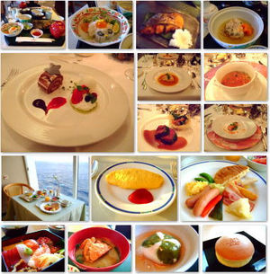 朝食・昼食は5フロアのダイニングで和食が、リドカフェでビュッフェ形式の洋食が提供される。1週間を越える程度のクルーズになると中華が供される場合もある。両方で食べることも可能である。