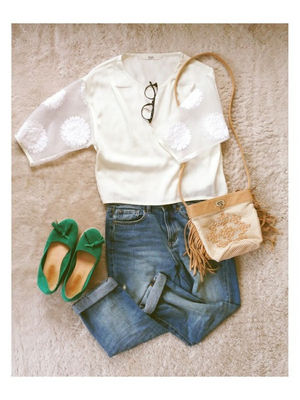 肩にリボンがついている甘めブラウスを、デニムでカジュアルダウンしてます^^