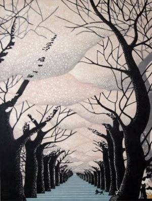 版画家 森村玲さんの作品。版画っぽくない構図と和色が絶妙な味。