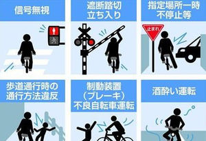 改正法では、従来の道交法違反にあたる悪質運転のうち、信号無視や酒酔い運転、交差点での一時不停止など14項目を危険行為と規定。自動車に比べ、運転ルールを学ぶ機会の乏しい自転車の運転者に対し、受講を通してマナーを向上させて自転車の死亡事故などを減らしたい考えだ。