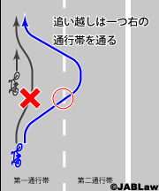 また、車両通行帯が設けられた道路では、一つ右の車両通行帯(通常は第二通行帯)を通らなければならない。