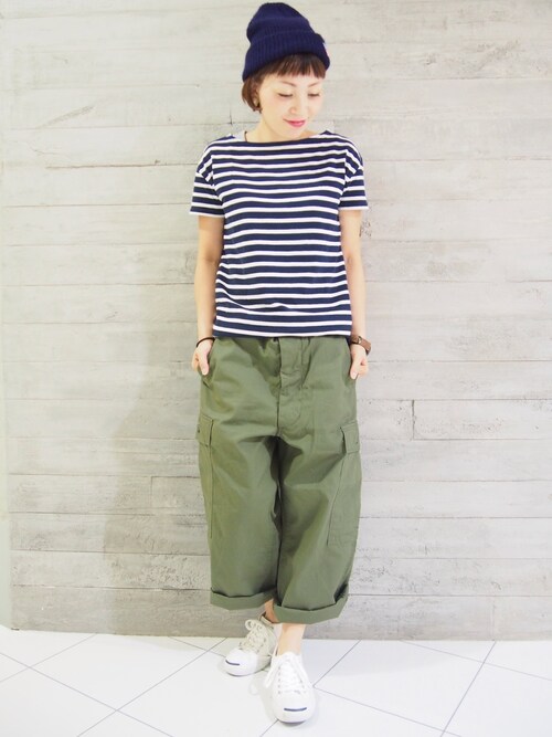 春夏にカーゴパンツを着こなす時は、ひざ下までロールマップさせてぬけ感を出してあげると涼しげにも見えてオススメ。