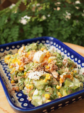 コーン缶とツナ缶とゆで卵に旬の塩もみ胡瓜を、マスタードマヨで和えただけ!朝食に時短で美味しいです。