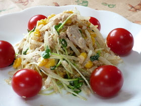 シャキシャキした食感のもやしと、ピリッとしたかいわれ大根にツナの旨みが加わったマイルドなサラダ。焼肉のたれが隠し味!