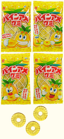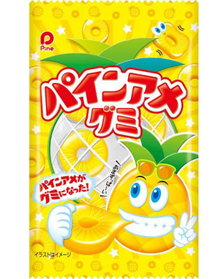 パインアメの特徴である、輪切りのパイナップルの形に仕上げた甘酸っぱくてジューシーなパインアメ味のグミです。