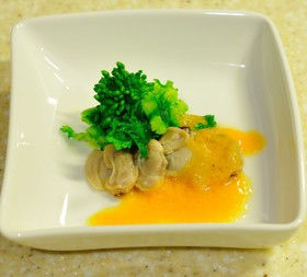 ひな祭りに菜の花とはまぐりを卵黄のソースを添えていただく大人の為の一品です。ディナーの前菜に、白ワインでどうぞ。