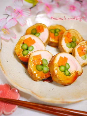 ひな祭りごはんで作った春のおかず。アスパラとにんじんを鶏むね肉で巻いた彩りが春らしい一品。鶏肉はびっくりするくらいしっとりやわらかでその中のアスパラとにんじんのシャキッとした食感が相性抜群。
