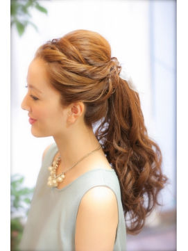 細かいカールのポニーアップヘア。