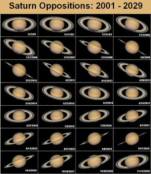土星の環は、土星の公転軌道面から26.7度傾いていて、その傾きを保ったまま太陽のまわりを約30年かけて一周しています。